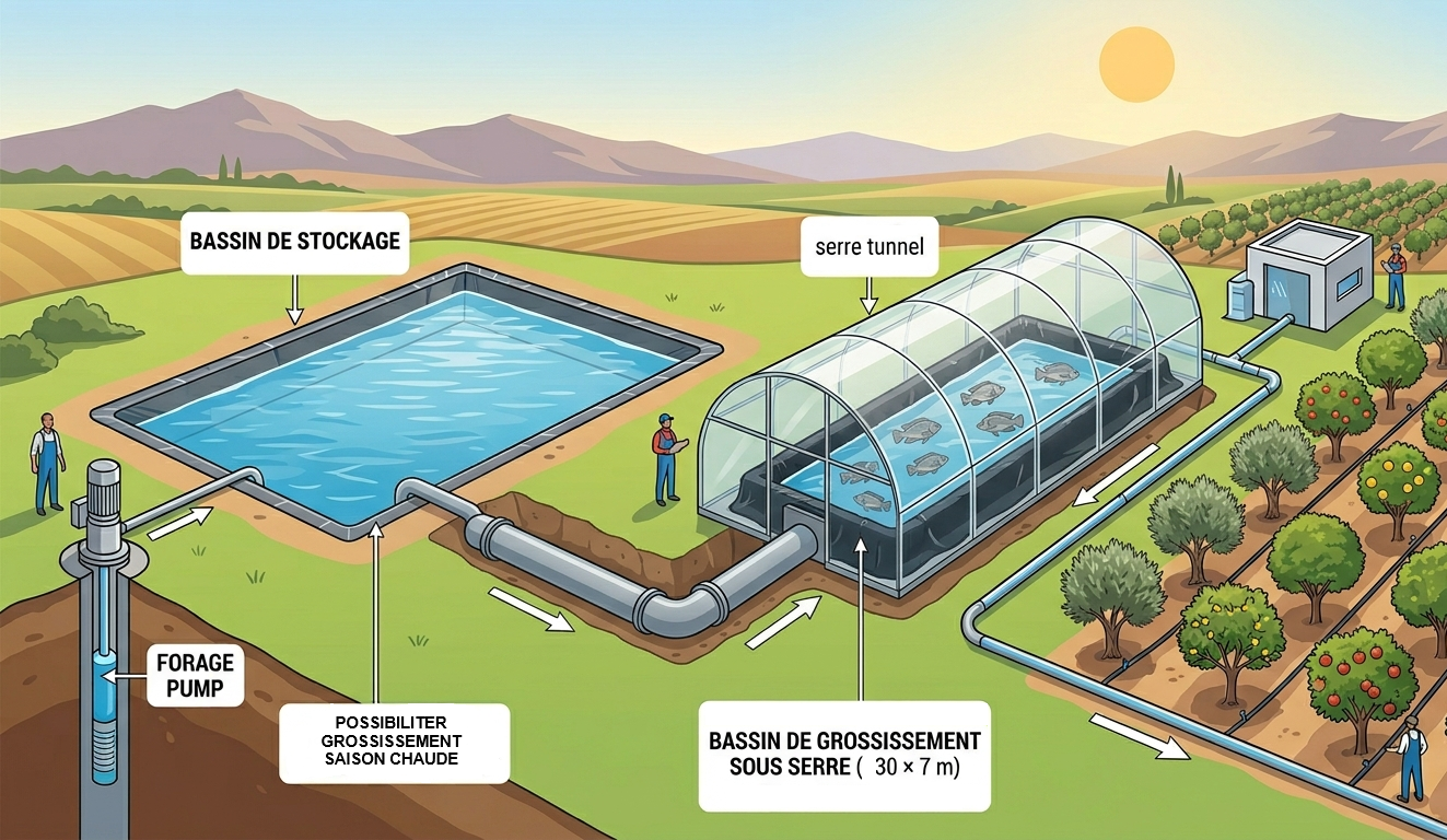حوض التسمين: تتدفق المياه بعد ذلك إلى الحوض المغطى بالدفيئة بأبعاد (30x 7 x 1,75 م) (الحجم: 367. 5 متر مكعب).