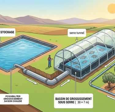 المنشأة: شبكة مكونة من 7 أحواض تسمين كبيرة تحت الدفيئات بأبعاد (30x 7 x 1,75 م) (الحجم: 367, 5 متر مكعب لكل حوض).